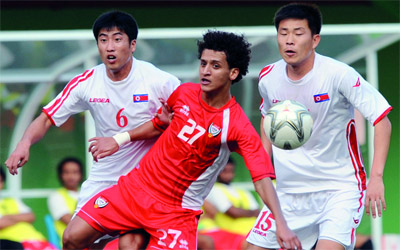عمر عبدالرحمن محاطاً بلاعبي كوريا الشمالية في المباراة السابقة. أ.ف.ب