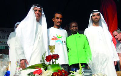 شهد نصف ماراثون رأس الخيمة أمس، سيطرة إثيوبية كينية على ألقابه، حيث تمكن الإثيوبي ديريبا ميرقا من إحراز المركز الأول لفئة الرجال، محققاً زمناً قدره 59 دقيقة و24 ثانية، وحل الكينيان بيرنارد وليونارد في المركزين الثاني والثالث. وفي فئة السيدات فازت الكينية ماري كاتانيا بالمركز الأول وحققت ساعة وخمس دقائق و50 ثانية. كما شهد السباق مشاركة مميزة لمواطني الدولة من أعضاء المنتخب الوطني. وتوج صاحب السمو الشيخ سعود بن صقر القاسمي عضو المجلس الأعلى حاكم رأس الخيمة، وسمو الشيخ محمد بن سعود القاسمي، ولي عهد رأس الخيمة، صباح أمس، الفائزين في السباق، الذي بلغت مجموع جوائزه 280 ألف دولار، وامتد لمسافة 21 كيلومتراً.