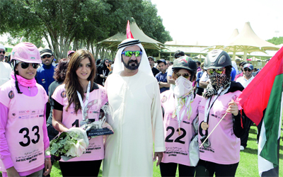 شهد صاحب السمو الشيخ محمد بن راشد آل مكتوم، نائب رئيس الدولة رئيس مجلس الوزراء حاكم دبي، سباق القدرة لمسافة 90 كيلومترا الذي أقيم أمس على ميادين قرية الامارات العالمية للقدرة بالوثبة ضمن منافسات الدورة الثانية لرياضة المرأة بدول مجلس التعاون الخليجي بمشاركة 53 فارسة.