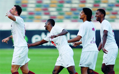 ماغراو ولاعبو الوحدة يحتفلون بالهدف الثاني في شباك ماجد ناصر. تصوير: إريك أرازاس