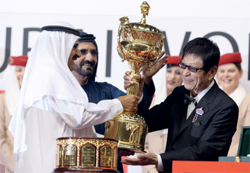 توج صاحب السمو الشيخ محمد بن راشد آل مكتوم، نائب رئيس الدولة رئيس مجلس الوزراء حاكم دبي، الحصان الياباني «فيكتوار بيسا» المملوك ليوشيمي ايشيكارا بكأس دبي العالمي للخيول في نسخته السادسة عشرة الذي أقيمت فعالياته أمس على مضمار ميدان.