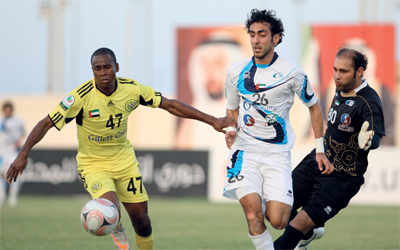 لاعب بني ياس يوسف جابر وبجــــــــــــــــــــــــــــــــــــــــواره لاعب الاتحاد إلياس كانو. تصوير: مصطفى قاسمي