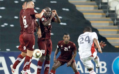 لاعب الجزيرة سبيت خاطر يسدد في حائط صد وحداوي. الإمارات اليوم