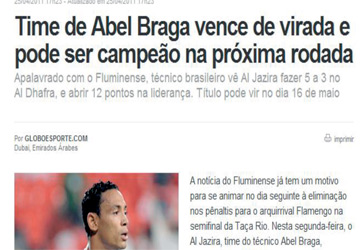 اهتمت صحيفة «غلوبو» البرازيلية، بالفوز العريض الذي حققه الجزيرة على الظفرة بخمسة أهداف مقابل ثلاثة في الجولة السابعة عشرة لدوري المحترفين لكرة القدم، وهو الفوز الذي قرب الجزيرة من منصة التتويج والفوز باللقب للمرة الأولى في التاريخ والجمع بين ثنائية في التاريخ. ونشرت الصحيفة تقريرا مطولا عن المباراة تحت عنوان «فريق أبل براغا يحول تأخره الى فوز عريض، والجولة المقبلة قد تتوجه بطلا»، ونشرت الصحيفة التقرير مرفقا بصورة للهداف البرازيلي ريكاردو اوليفيرا، وهو يحتفل بهدفه في المباراة، وصورة أخرى للنجم الأرجنتيني ديلغادو الذي غاب عن المباراة بسبب الإصابة، وهو يقدم قميص النادي هدية لقائد منتخب هولندا السابق فيليب كوكو، الذي احترف لفترة مع الجزيرة وحضر إلى أبوظبي وشاهد المباراة. وتفصيلاً كتبت الصحيفة «مدرب فلومنينزي المقبل أبل براغا قاد الجزيرة الإماراتي للفوز على الظفرة 5/3 ووسع الفارق بينه وبين منافسه بني ياس إلى 12 نقطة في الصدارة، ليقترب خطوة كبيرة من الفوز باللقب، وسيتوج رسميا يوم 16 مايو المقبل». وتابعت «الأخبار القادمة لأنصار فلومنينيزي كانت تحمل اسبابا للابتهاج والسعادة، بعد يوم واحد فقط من العقوبات التي وقعت على النادي عقب مباراته مع منافسه فلامنغو في الدور ربع النهائي لكأس ريو يوم الأثنين الماضي، حيث نجح مدرب الفريق المقبل أبل براغا في قيادة فريقه الحالي الجزيرة للفوز على الظفرة 5/،3 ليواصل انفراده بصدارة الدوري الإماراتي، مقترباً من الجمع بين لقبي الدوري والكأس، ورفع الفوز رصيد الجزيرة إلى 43 نقطة ليوسع الفارق في المنافسة بينه وبين منافسه بني ياس إلى 12 نقطة كاملة. وقبل خمس جولات من نهاية الموسم يملك الجزيرة 31 هدفا واهتزت شباكه 10 مرات فقط، وهو ما يؤكد تفوقه دفاعا وهجوما على كل منافسيه، ويمكن للمدرب البرازيلي أن يرفع اللقب إذا فاز على الوصل في الجولة المقبلة التي ستقام يوم 16 مايو، وسيخوض فيها بني ياس مباراته أمام دبي التاسع، وفي حال فوزه على الوصل سيتوج الجزيرة بطلاً للدوري قبل نهاية المسابقة بأربع جولات».