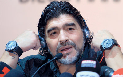 مارادونا ضبط ساعتيه على توقيت الأرجنتين ودبي. تصوير: أسامة أبوغانم