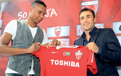 كانافارو يسلّم قميص الأهلي إلى جاجا. تصوير: باتريك كاستيلو