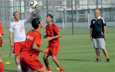 رستم (يمين) يتابع تدريبات المنتخب اللبناني. الإمارات اليوم