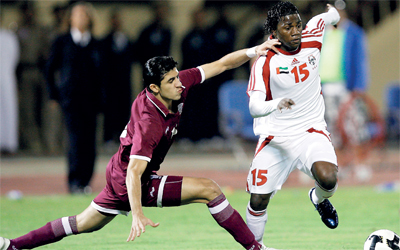 إسماعيل الحمادي يجتاز الدفاع القطري في مباراة سابقة. تصوير: أسامة أبوغانم
