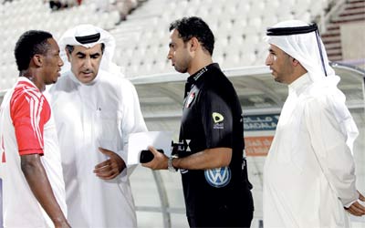 الرميثي متحدثاً إلى أحمد خليل قبل مباراة قطر. الإمارات اليوم
