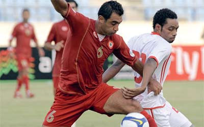 لاعب الإمارات أحمد جمعة في صراع مع المدافع اللبناني عباس كنان. إي.بي.إيه