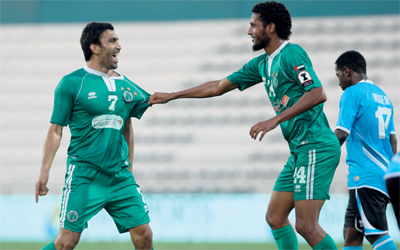 لاعبا الشباب عيسى عبيد وحيدروف يحتفلان بالفوز. تصوير: مصطفى قاسمي