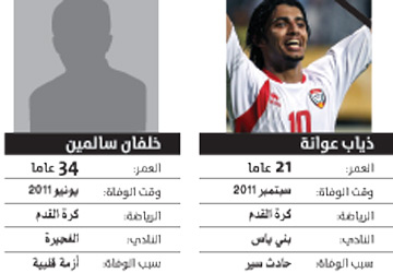 وفتحت وفاة لاعب بني ياس والمنتخب الوطني ذياب عوانة (21 عاما)، الأحد الماضي، في حادث مروري على طريق أبوظبي أثناء عودته من معسكر الأبيض المقام في العين، الذاكرة لحالات الموت التي أودت بحياة رياضيين في مختلف الألعاب.