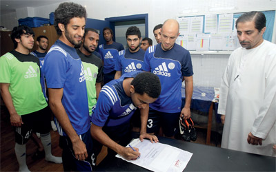 لاعبو النصر وقّعوا قبل التدريب. تصوير: تشاندرا بالان