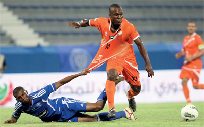 لاعب عجمان أوليفيه يتعرض لمضايقة من دفاع النصر. تصوير: مصطفى قاسمي