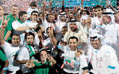 فرحة كبيرة للاعبي الشباب بعد التتويج باللقب الخليجي. تصوير: أسامة أبوغانم