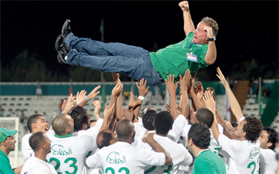 لاعبو الشباب يحتفون بالمدرب البرازيلي بوناميغو بعد الفوز بكأس الخــــــــــــــــــــــــــــــــــليج. تصوير: أسامة أبوغانم