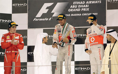 ظفر سائق فريق ماكلارين مرسيدس، البريطاني لويس هاملتون، بلقب سباق جائزة الاتحاد للطيران الذي أقيم مساء أمس، على حلبة مرسى ياس، بعد أن استغل انسحاب بطل العالم وسائق ريد بول سيبيستيان فيتيل في اللفة الأولى من السباق ليحافظ هاملتون على صدارته حتى خط النهاية، محققاً فوزه الثالث خلال موسم بطولة العالم لـ«الفورمولا1».