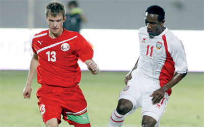 أحمد خليل محاصر من لاعب بيلاروسي. من المصدر