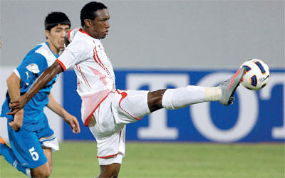 أحمد خليل يحاول تهدئة الكرة فــــــــــــــــــــــــــــــــــــــي مباراة أوزبكستان. تصوير: إريك أرازاس