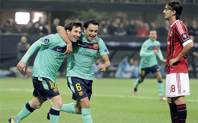 ميسي وتشافي بعد تسجيل هدف الفوز لبرشلونة. إي.بي.أيه