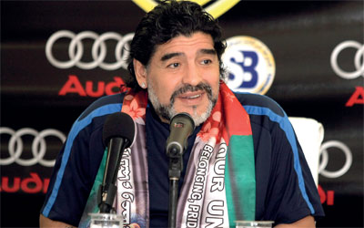 وظهر مارادونا في المؤتمر الصحافي، أول من أمس، الخاص بمباراة اليوم بين الوصل والشباب في دوري المحترفين، مرتدياً وشاحاً يحمل علم الإمارات، مكتوباً عليه «الاتحاد.. فخر وانتماء وعطاء»، وحرص على تهنئة الشعب الإماراتي بمناسبة الاحتفال باليوم الوطني الـ40 للدولة، متمنياً أن يحضر في السنوات المقبلة إلى الدولة لحضور احتفالات أخرى بهذه المناسبة الكبيرة.