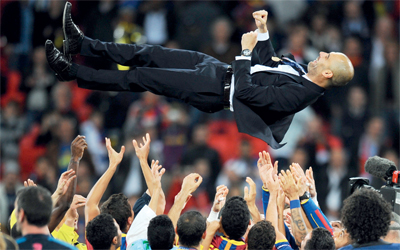 لاعبو برشلونة أصحاب فضل على مدربهم غوارديولا. أ.ف.ب