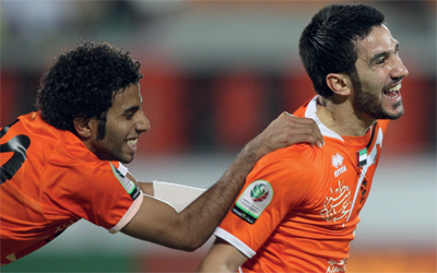 فرحة كبيرة للاعبي عجمان بهدف الفوز. تصوير: أسامة أبوغانم