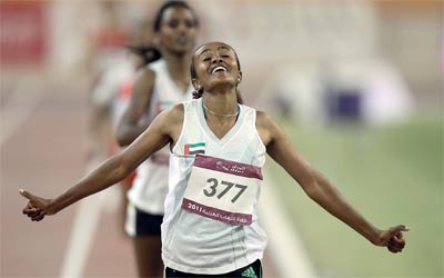 العداءة الإماراتية عالية سعيد بطلة ذهبية 5000 متر. أ.ف.ب