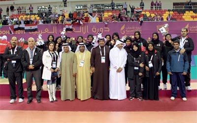 أشاد رئيس البعثة الإماراتية في الدورة العربية عبدالمحسن الدوسري، بالإنجاز الرائع الذي حققه المنتخب الوطني لكرة الطائرة للسيدات بحصوله على الميدالية البرونزية. وكان فريق السيدات هو المنتخب الوحيد في لعبة جماعية الذي مثل الدولة في الدورة، وحل في المركز الثالث بعد مصر التي فازت بالذهب والجزائر التي حلت في المركز الثاني ونالت الفضية، واقيمت مراسم التتويج، مساء أول من أمس، في صالة نادي الريان، وحضرها رئيس البعثة الإماراتية ورئيس اللجنة الفنية باللجنة الأولمبية الوطنية محمد الكمالي، ونائبة مديرة الوفد الرياضي عائشة السويدي،ونائب رئيس اتحاد اللعبة سعيد الكثيري، والمسؤول الفني باللجنة الأولمبية ناصر غريب.