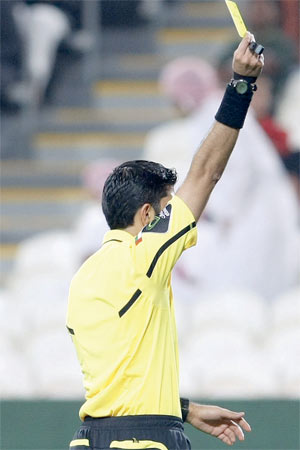 محمد عبدالله ينذر عبدالله جاسم لتسببه في ضربة جزاء. تصوير: إريك أرازاس