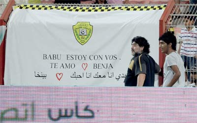 «الإمارات اليوم» وقفت عند أبرز الأحداث التي واجهت مارادونا منذ وصوله إلى دبي وتوقيعه على عقد قيادة الفهود، مروراً بركله أحد مشجعي الوصل، وذهابه إلى أبوظبي لتقديم العزاء في وفاة اللاعب الراحل ذياب عوانة، وخسارته من دبي بخماسية نظيفة، ووفاة والدته دالما سالفادورا (دونا توتا)، وتقديمه مكافأة مالية للاعبي الوصل من حسابه الخاص، في سابقة تاريخية بالملاعب الإماراتية يقوم بها مدرب تجاه لاعبيه، وانتهاء بخضوعه لعملية جراحية الأسبوع الماضي لإزالة الحصوة في الكلى.