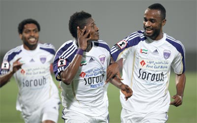 نجم العين جيان يحتفل بالتسجيل مرتين في شباك الوحدة. تصوير: إريك أرازاس
