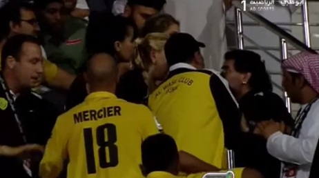 وتدخلت الشرطة لاحتواء الموقف لكن شخص أخر تدخل في الأزمة ما أثار زوجة مارادونا التي تعالى صوتها بشكل دفع مارادونا لترك الملعب والتوجه للمدرجات للدفاع عنها.