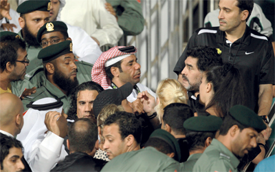 مارادونا وزوجته وصديقاتها محاطون برجال الشرطة على مدرجات نادي الشباب. الإمارات اليوم