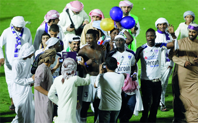 جيان محاطاً برفاقه ومشجعي العين عقب مباراة الجزيرة. تصوير: إريك أرازاس