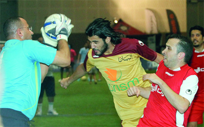 حارس «الإمارات اليوم» سيد مصطفى يتصدّى لكرة «البيان». الإمارات اليوم