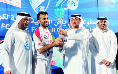 الخييلي يسلم الكأس إلى اللاعب الكويتي أحمد صبيح. تصوير: إريك أرازاس