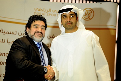 أصبح أسطورة كرة القدم الأرجنتينية، دييغو مارادونا، سفيرا رياضيا شرفيا لدبي، حيث أعلن مجلس دبي الرياضي، اليوم، عن توقيع عقد شراكة مع مارادونا، تحت اسم "مارادونا سفيرا رياضيا شرفيا لمدينة دبي".