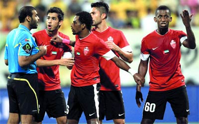 لاعبو الأهلي يعترضون على قرارات الحكم عمار الجنيبي. تصوير: باتريك كاستيلو