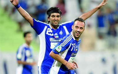 ماسكارا يحتفل بهدفه الثاني وسط فرحة عارمة من زميله نشأت أكرم. تصوير: أسامة أبوغانم
