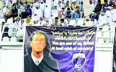 ساند الجمهور الإماراتي بمختلف أطيافه مدرب الوصل، الفرنسي برونو ميتسو، الذي يمرّ بمرض مزمن، وذلك عبر التغريدات على موقع التواصل الاجتماعي «تويتر»، واللافتات المختلفة التي رفعوها خلال الجولة الرابعة من دوري المحترفين، التي غاب عنها ميتسو لتلقيه العلاج. وقال المشجع خالد جمعة على حسابه في «تويتر»، إن «إشادة المدرب المؤقت للوصل جيل مورسيو بالمدرب ميتسو تعبير عن لمسة وفاء تجاه المدرب الذي أفرحنا جميعاً في دوري الخليج ،18 ونتمنى له الشفاء العاجل». وقال سلطان آل علي: «بادرة طيبة من جمهور الأهلي، إذ إنها وضعت لافتة تتمنى فيها الشفاء العاجل لميتسو». وقال حساب مجلس محبي النصر: «نتمنى الشفاء العاجل للمدرب القدير برونو ميتسو، وعودته لقيادة الفريق الأول للوصل من جديد»، وقال طارق الهرمودي: «الجمهور الأهلاوي يتمنى الشفاء العاجل للمدرب الفرنسي ميتسو». وأشادت الكثير من الجماهير بالزيارة التي قام بها مدرب الوصل السابق الأرجنتيني دييغو مارادونا للاطمئنان على صحة ميتسو، إضافة إلى تصريحات مدرب الأهلي، الإسباني كيكي فلوريس، ومدرب النصر، الإيطالي والتر زينغا، والتي من خلالهما تمنيا الشفاء العاجل لزميلهما في المهنة. وكانت جماهير الأهلي قد رفعت لافتة خلال مباراة الشباب الأحد الماضي، تقول باللغة الإنجليزية «نتمنى لك الشفاء العاجل يا ميتسو»، فيما رفعت جماهير العين في مباراة دبا الفجيرة لافتة تصف فيها مدربها السابق الذي حقق للنادي أكبر إنجاز في تاريخه في 2003 بإحراز دوري أبطال آسيا بأنه «منا وفينا»، وتمنت له الشفاء العاجل، ورفعت جماهير النصر في مباراة اتحاد كلباء لافتة تتمنى الشفاء العاجل لمدرب الوصل كذلك.