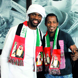 ارتدى نجم الأهلي البرازيلي غرافيتي وزميله الكاميروني أتشيلي إيمانا الثوب الإماراتي الوطني، إضافة إلى «العصامة» أو «الحمدانية» الإماراتية التقليدية، وانضما إلى زملائهما بشير سعيد وإسماعيل الحمادي وعبيد الطويلة وماجد ناصر في تركيب أعلام الدولة في شعبية الدفاع بدبي، في منظر لافت للأنظار أول من أمس.