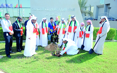وقام نائب رئيس الاتحاد عبيد سالم الشامسي، بغرس شجرة الاتحاد بحضور عضو مجلس الإدارة سعيد عبيد الطنيجي، ومدير إدارة العلاقات العامة عبدالقادر حسن، ومساعد الأمين العام أيمن هارون، وموظفي الإدارة التنفيذية لاتحاد الكرة.