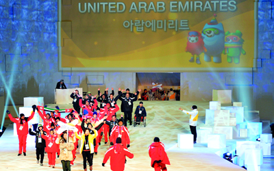 وكانت بعثة الدولة قد وصلت إلى القرية الأولمبية ببيونغ شانغ مع بدء مراسم الافتتاح بعد رحلة شاقة امتدت لأكثر من 17 ساعة منذ المغادرة من أبوظبي ليلة الاثنين، عبر «طيران الاتحاد»، الناقل الرسمي للبعثة التي ترأسها أمين السر العام لاتحاد المعاقين، ماجد العصيمي، ونائب رئيس وفد الإمارات، فاضل المنصوري.