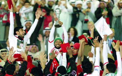 مطر يحمل كأس «خليجي 21». تصوير: أسامة أبوغانم