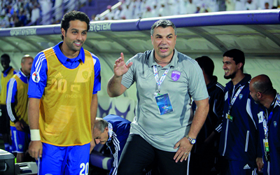 القحطاني يهنئ مدرب العين كوزمين. تصوير: إريك أرازاس