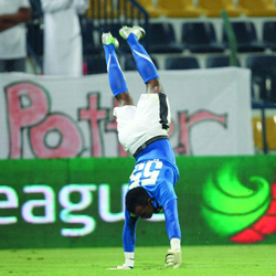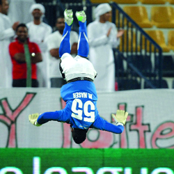 احتفل حارس مرمى الأهلي ماجد ناصر على طريقته الخاصة، بعد الفوز العريض الذي سجله الفرسان الحمر على دبي 6-3، في الجولة الـ19 من دوري المحترفين لكرة القدم، ولفت «الكابتن ماجد» الأنظار باحتفاله، كونه استعرض بقدرات بدنية وبهلوانية عالية.