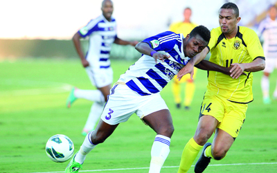 لاعب كلباء طلال عبدالله مع جيان في لقاء الذهاب. تصوير: إريك أرازاس