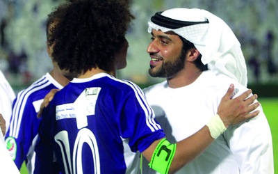 عبدالله بن محمد يهنئ «عموري» بعد حسم لقب الدوري. تصوير: إريك أرازاس