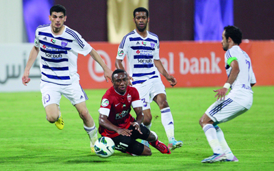 العنزي (يسار) يقطع كرة أحمد خليل. تصوير: إريك أرازاس